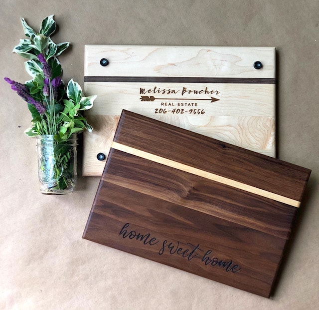 These beautiful black walnut cutting boards are handcrafted in Vancouver, WA. These boards are created almost exclusively from rescued or reclaimed American hardwoods. They are functional for everyday use and elegant for special occasions. Whether fixing dinner for the family or serving hors-d’oeuvres for a party, this cutting board is durable and decorative. Brand them anywhere on the front of the board or the back to create a stunning gift by itself or pair it perfectly with a Cutco gift set.